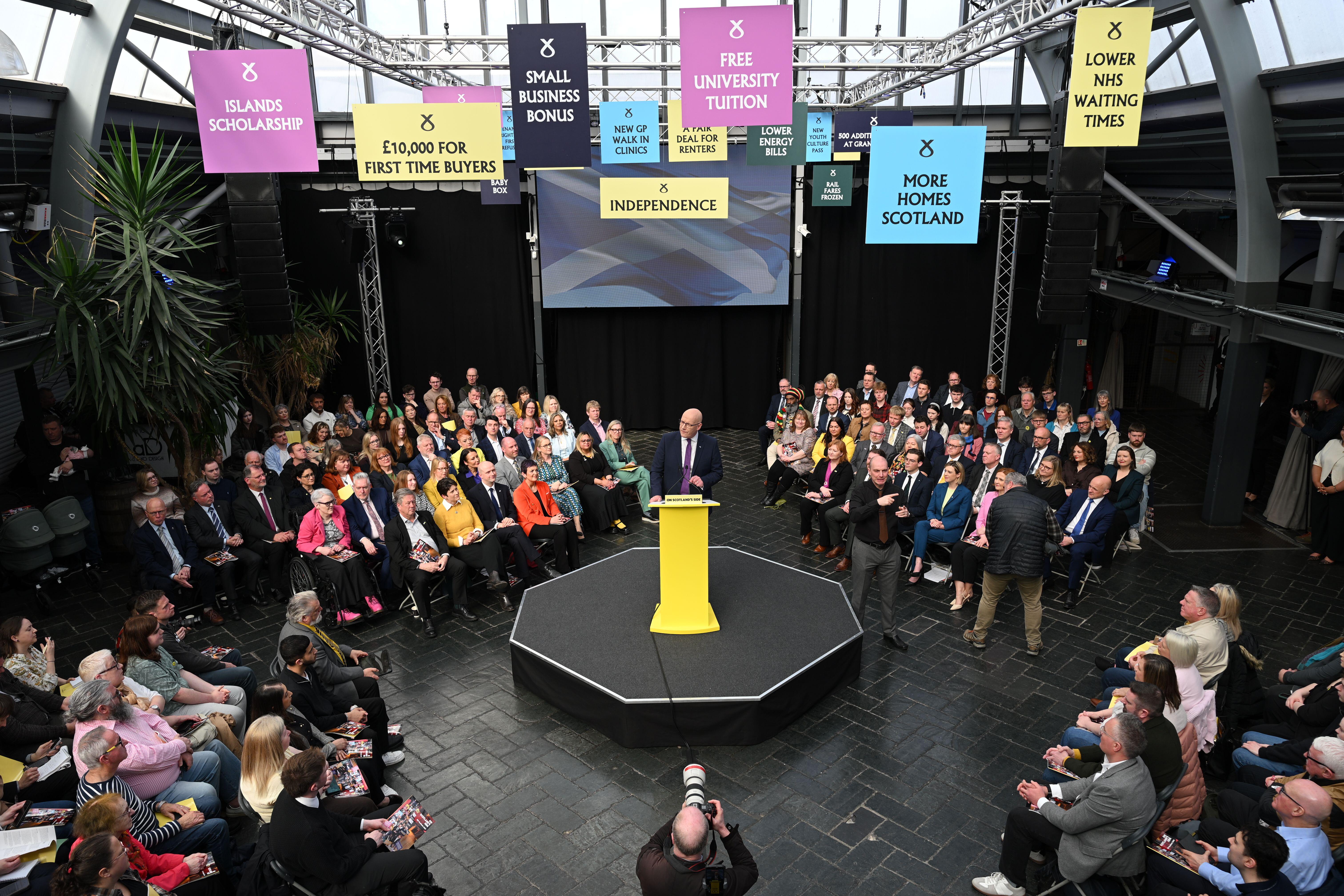 John Swinney stood on a podium underneath a disco ball to unveil his party’s 2026 election manifesto.